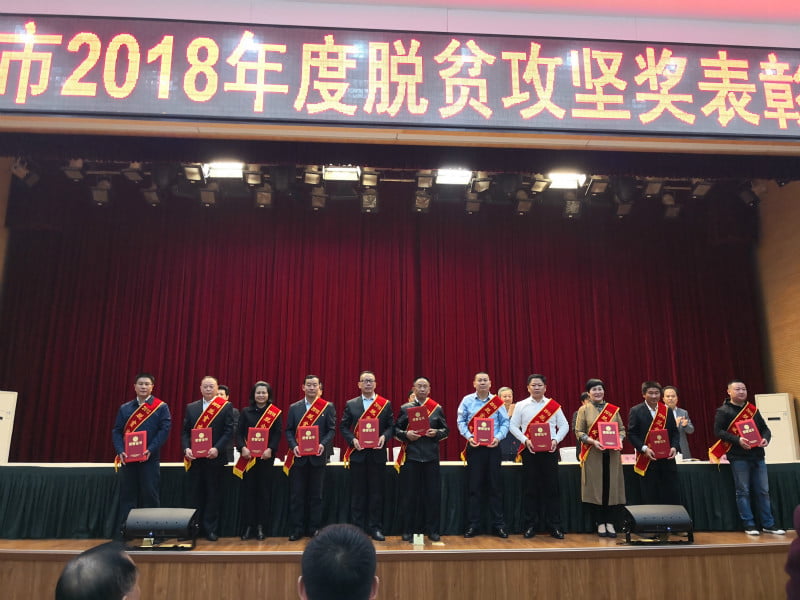 孔德穩(wěn)(中)榮獲信陽(yáng)市2018年度脫貧攻堅(jiān)“奉獻(xiàn)獎(jiǎng)”